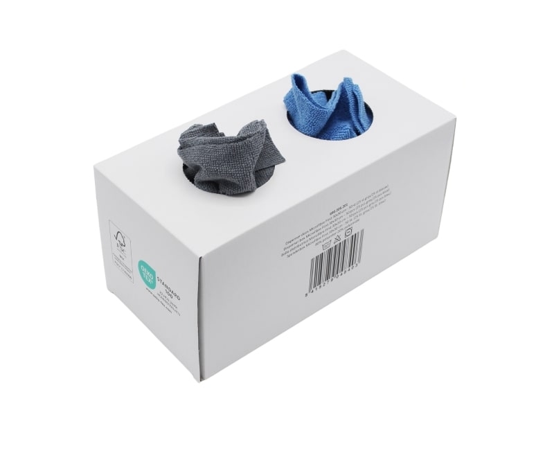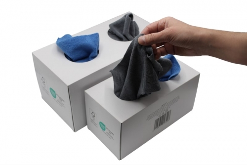 Discover our FIRST boxed microfiber cloths, conveniently packaged in FSC-certified boxes of 50 pieces, divided into two colors (25 gray and 25 blue) for optimal organization.
